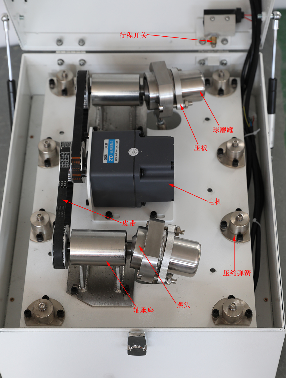 1.壓縮彈簧  2.電機  3.軸承座   4.球磨罐   5.壓板