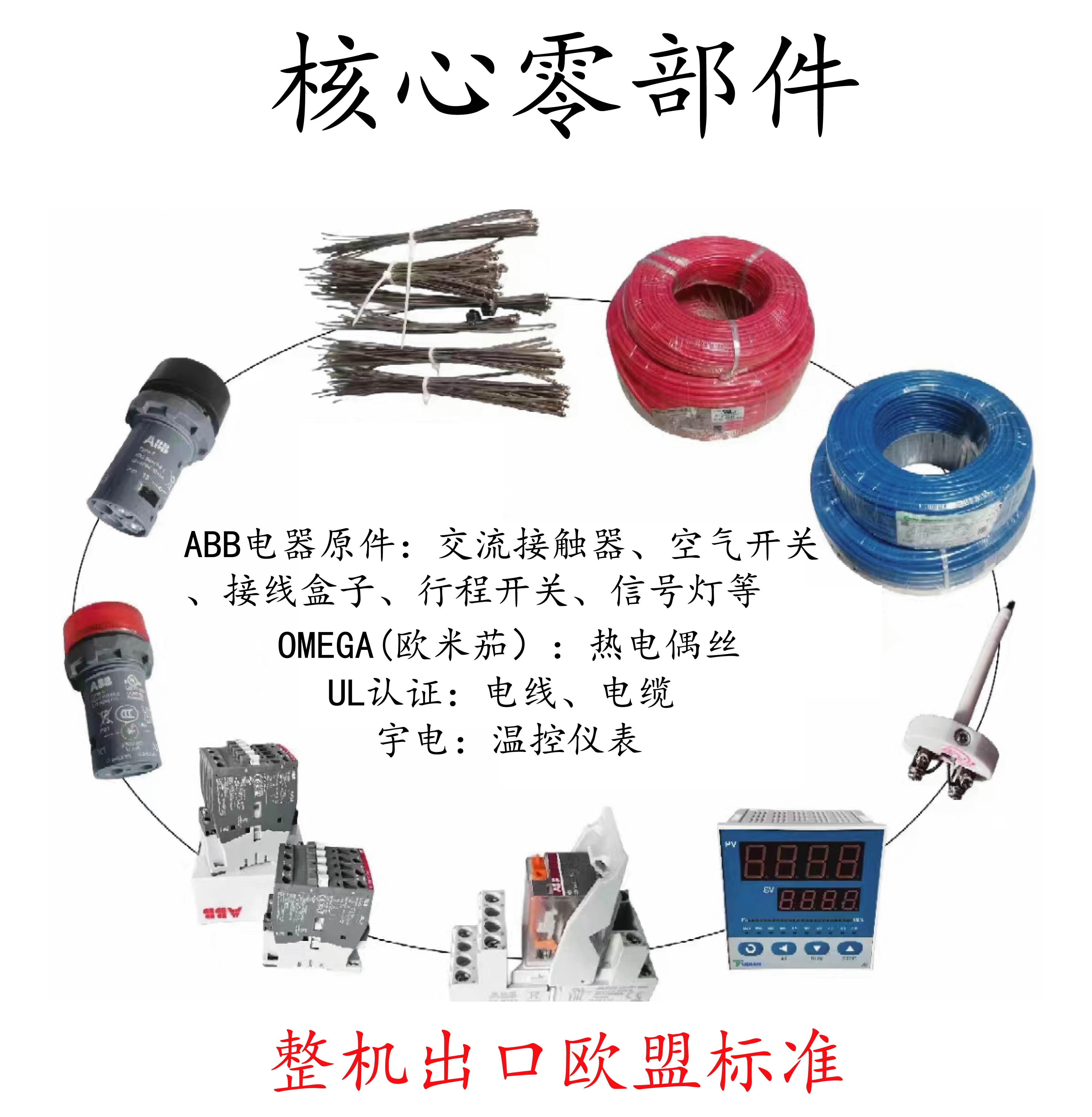 ?認證標準及核心零部件整機核心部件均符合CE、UL、MET等認證標準;核心零部件有ABB電器元件,UL認證電線、電纜,歐米茄,宇電、歐陸儀表等。